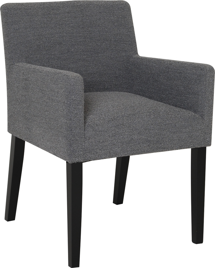 Matstol med klädsel av bouclétyg och svartlackerade träben.