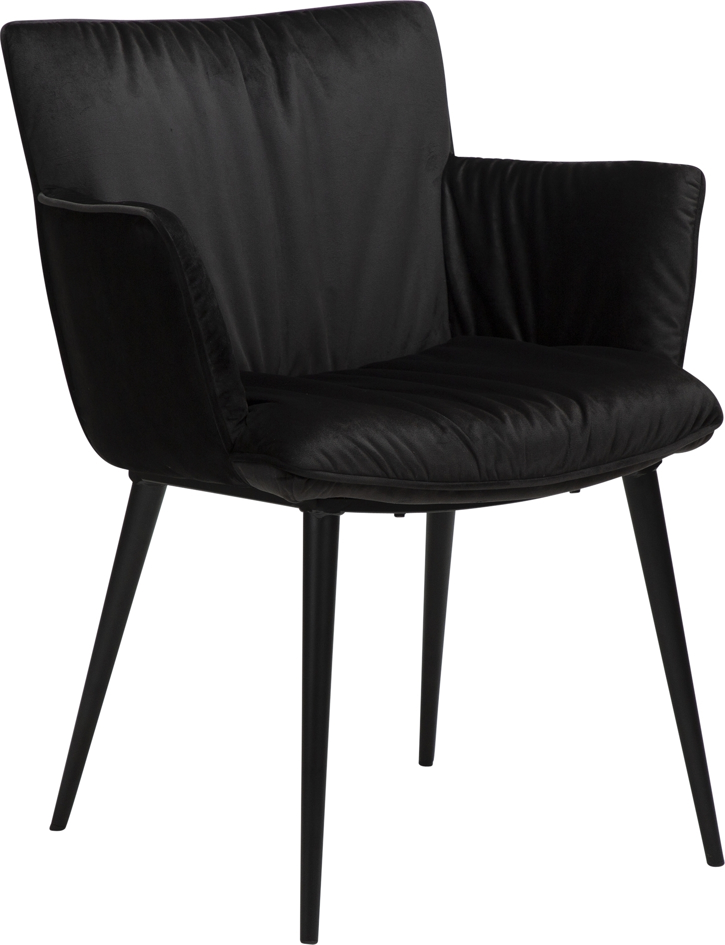 Karmstol med spännande design formgiven av den danska designerduon Says Who. Den löst åtsittande klädseln skapar en flytande effekt och gör designen varm och inbjudande samtidigt som den fokuserar på hög sittkomfort. Koniskt underrede av svart pulverlackad metall.