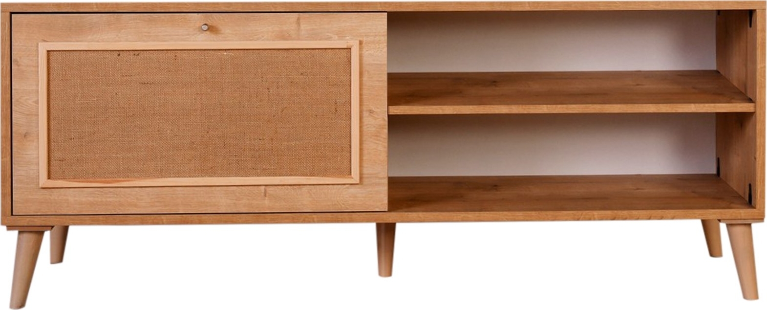 Mediabänk av trä med ben av metall. Lucka med juteväv.