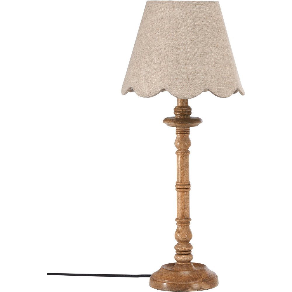 En dekorativ bordslampa inspirerad av gamla ljusstakar. Lampfoten har naturfärgad finish med naturliga skiftningar som gör varje lampa unik. Skärmen är i linnetyg med fin struktur, lätt utställd och har en vågig form nedtill. 1,8m svart plastsladd med strömbrytare, E27 lamphållare.