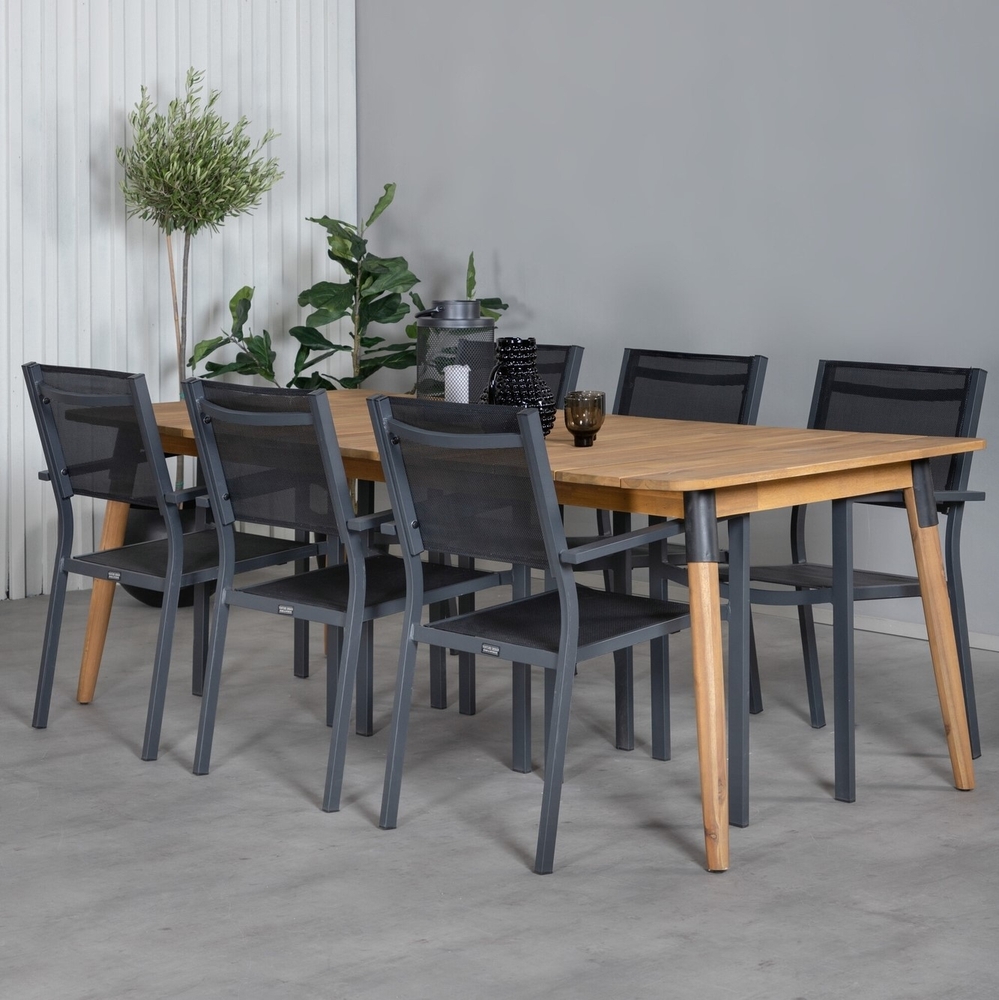 En inbjudande matgrupp som skapar en modern och familjär känsla till rummet! Vårt eleganta matbord Julian i Akaciaträ kombineras perfekt med stilsäkra matstolar i serien Copacabana. Stolarnas höga sittkomfort bjuder in till långa och härliga stunder runt middagsbordet i sommar tillsammans med nära och kära.