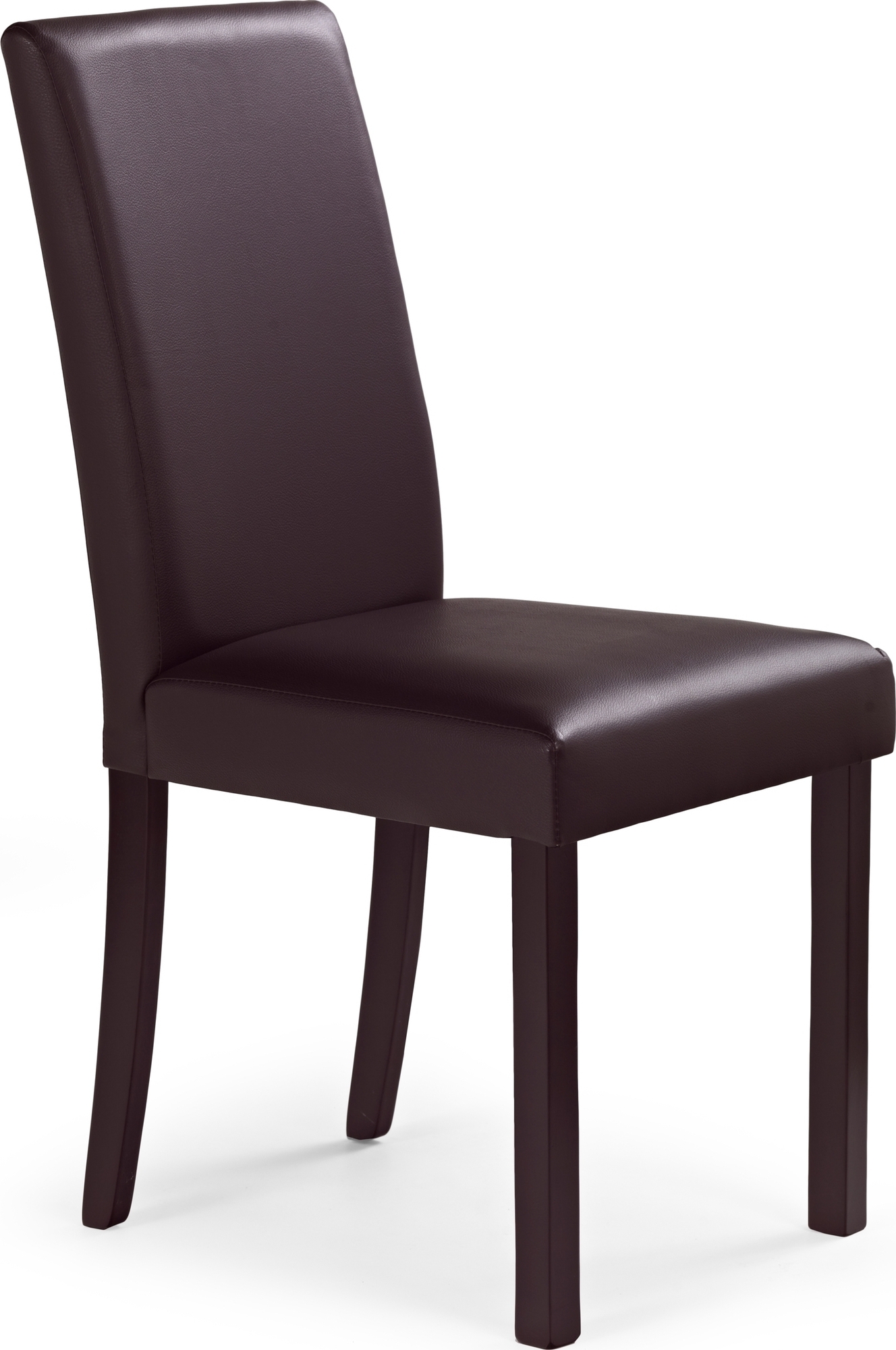 Snygg matstol med en klassisk design. Benen är tillverkade i massiv trä med ett snyggt utförande av mörk valnöt. Sitsen och ryggstödet är klädda i ett mycket behagligt brunt konstläder för maximal komfort.