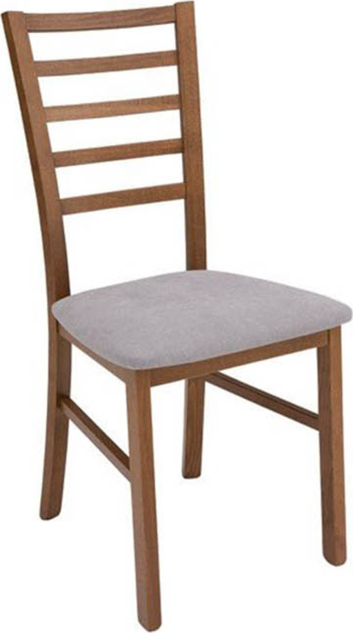 Matstol av trä med klädsel av tyg.