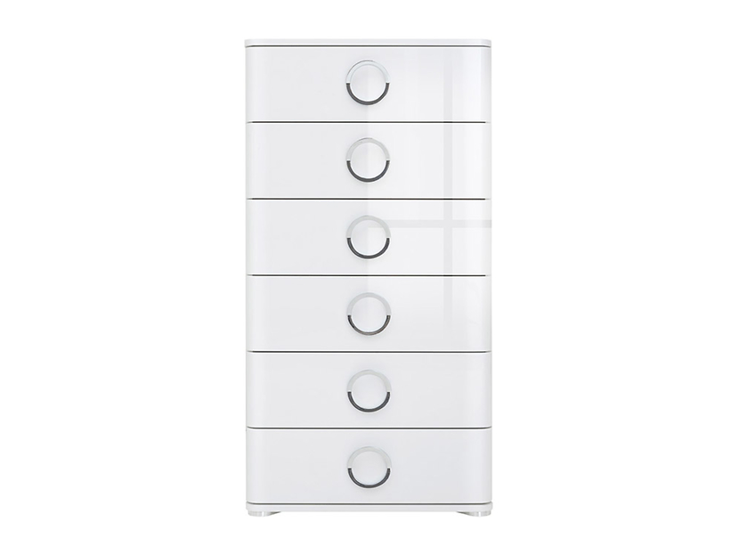 Byrå med sex rymliga lådor som har dekorativa handtag och högblank front. Kombinera gärna med andra möbler i samma serie. Tyst och mjukstängande funktion på lådorna.