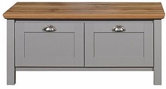 Bänk med yta av grå laminat, halvmåneformade handtag. Toppskiva av valnötsmitation. Bänken har 4 dörrar (2 på vardera sida), med förvaring bakom (ej lådor). I serie Källunda finns både byråer i olika storlekar men även avlastningsbord och bänkar.