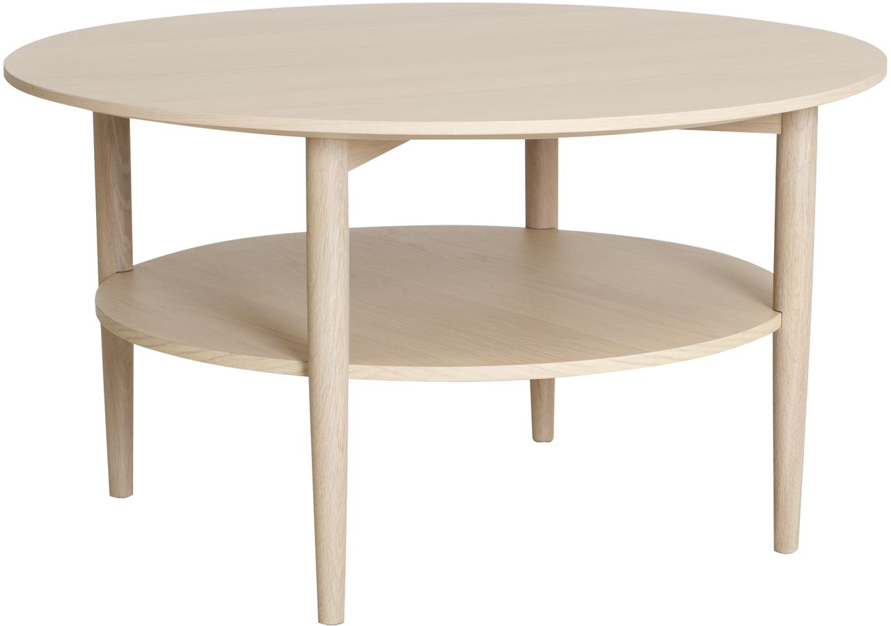 Soffbord Kalmar i vitpigmenterad och lackad ekfaner med en diameter på 90 cm. Bordet har även en praktiskt hylla undertill. Bordet finns även i rektangulärt utförande.