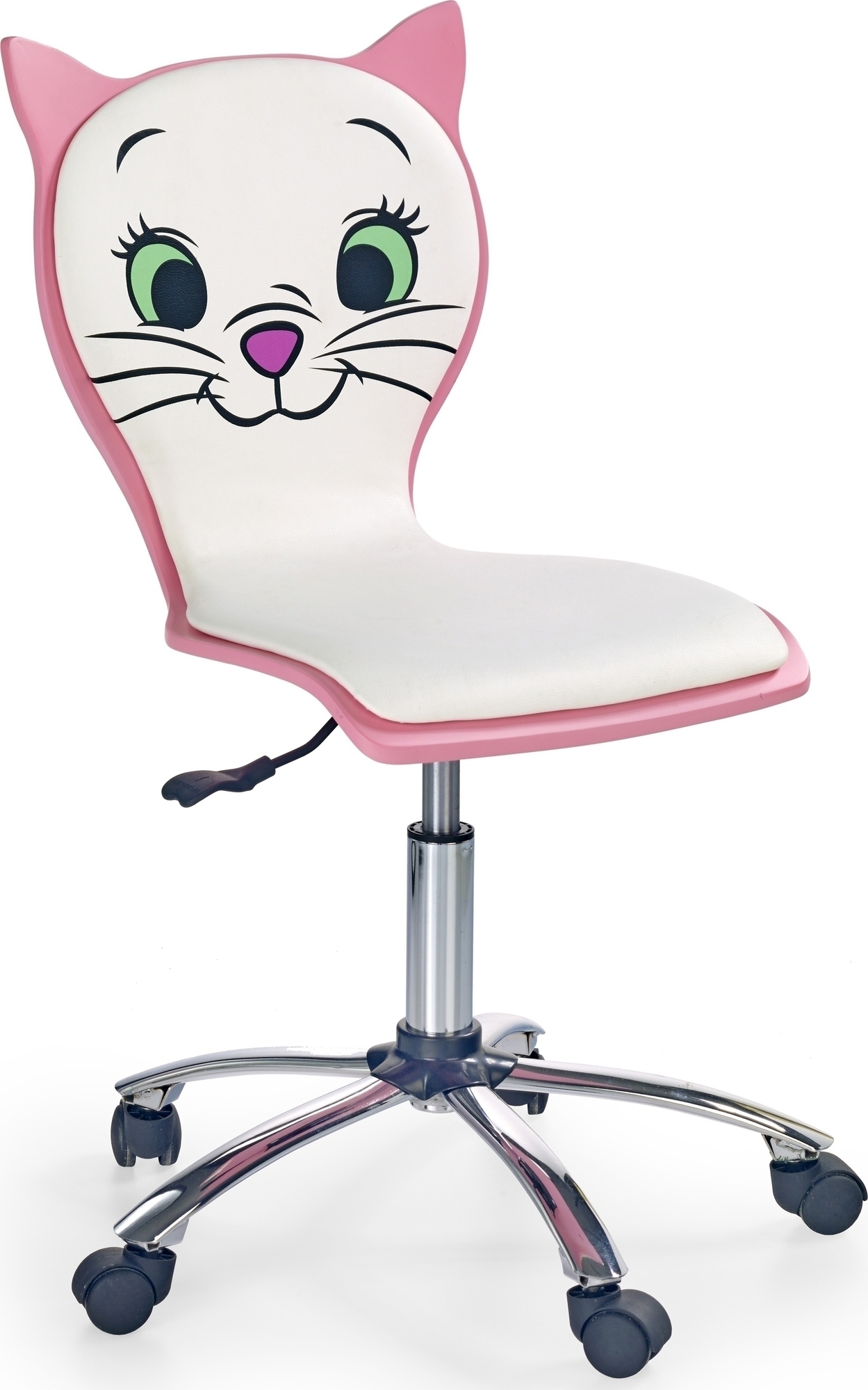 En mysig skrivbordsstol som passar perfekt till barnens rum. Tillverkad i metall och målad plywood med en klädsel i mycket behagligt konstläder med tryck av en katt som matchar designen på ryggstödet. Höj- och sänkbar sits och lätt att förflytta med hjälp av hjulen på den kromade stjärnfoten.