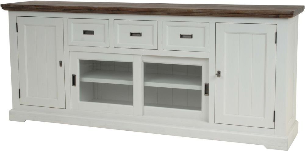 Robust och stiligt sideboard i vitt med mörk lackad och antikbehandlad topp. Gott om förvaring bakom de 2 st dörrarna, 2 st skjutdörrar med glas och 3 st lådorna.