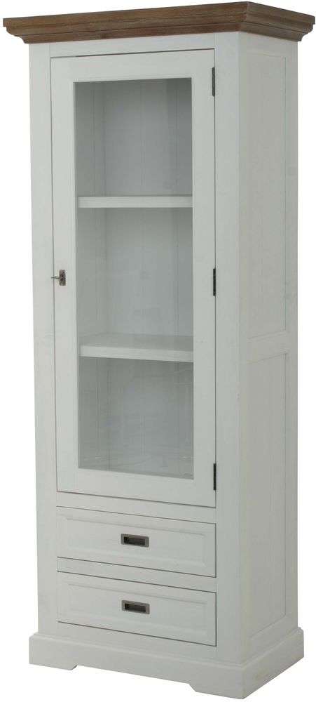 Elegant vitrinskåp i vitt med en dörr och två lådor. Toppen är lackad och antikbehandlad. Erbjuder förvaring till prydnadssaker och annat, samtidigt som skåpet blir ett snyggt tillskott till inredningen.