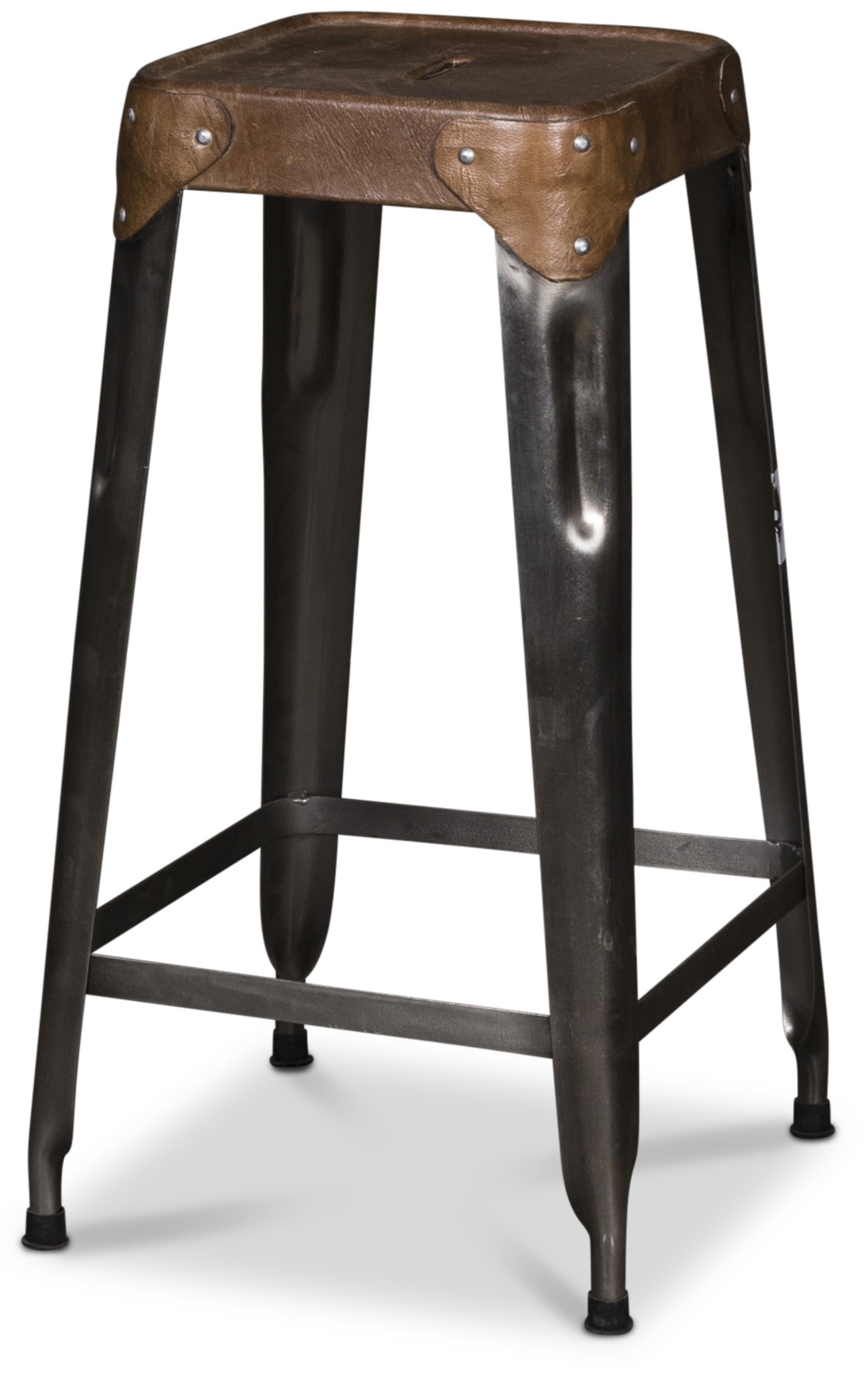 Häftig barstol med underrede i metall och sits i mörkbrunt läder.