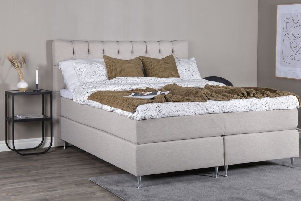 Sammantaget är sängen uppbyggd för att ge en extra skön sovkomfort samt ge ett enhetligt intryck i sin helklädda design. Hela sängen vilar på 12 cm höga champangeben i silvrig aluminium. Mått: Längd: 200 cm, Bredd: 180 cm, Höjd: 73 cm.