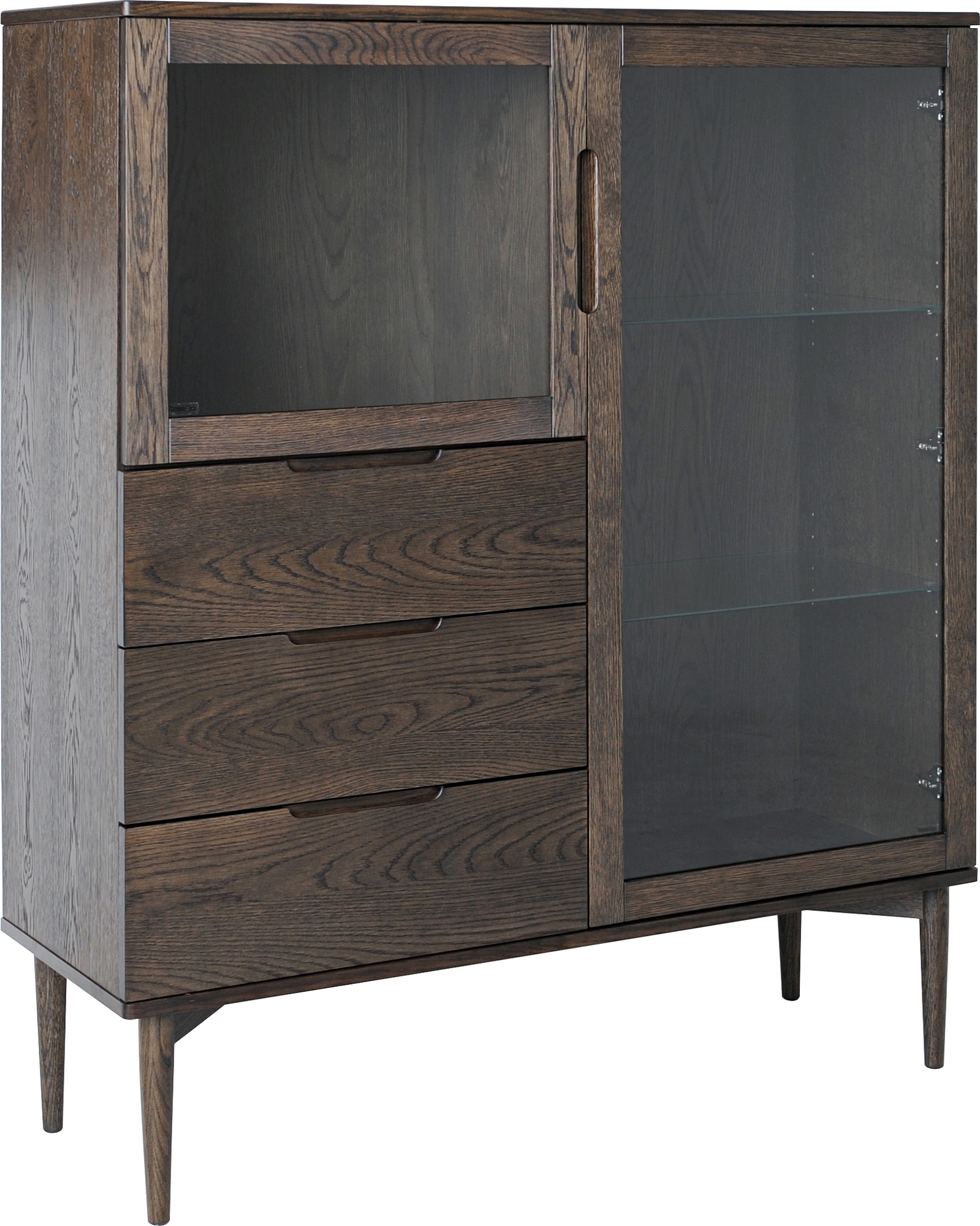 Vitrinskåp i brunoljad ekfanér med massiva ekben och invändig LED belysning. Glasdörrar med soft-close mekanism. Levereras omonterad.