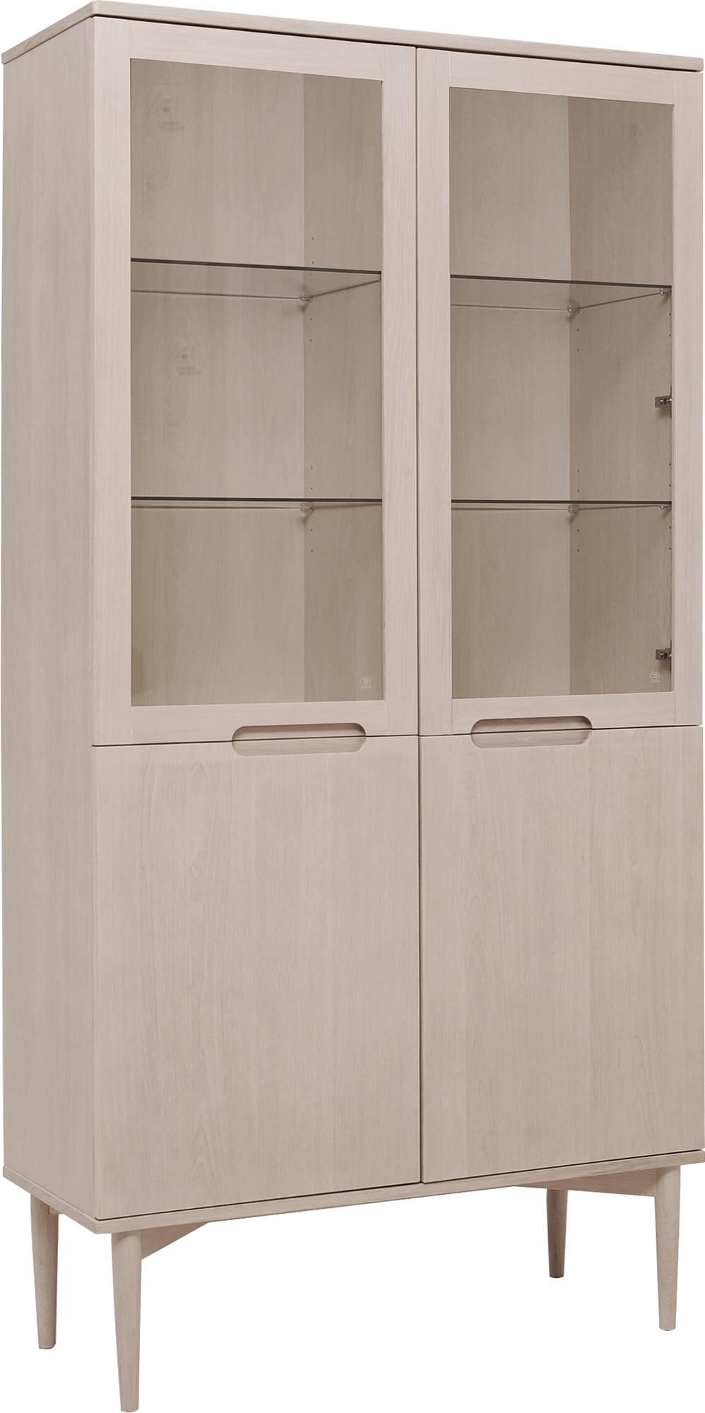 Vitrinskåp i vitpigmenterad ekfanér (WL102) med massiva ekben och invändig LED belysning. Glasdörrar med soft-close mekanism. Levereras omonterad.