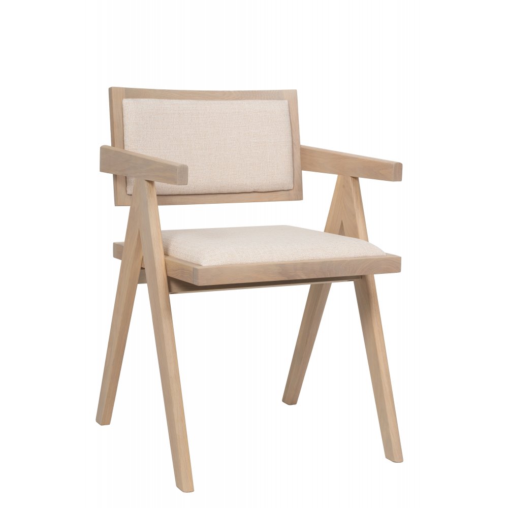 Sits och rygg är klädda i ett linnefärgat tyg som skapar en behaglig kontrast mot den vitpigmenterade eken och ger en varm, inbjudande känsla.