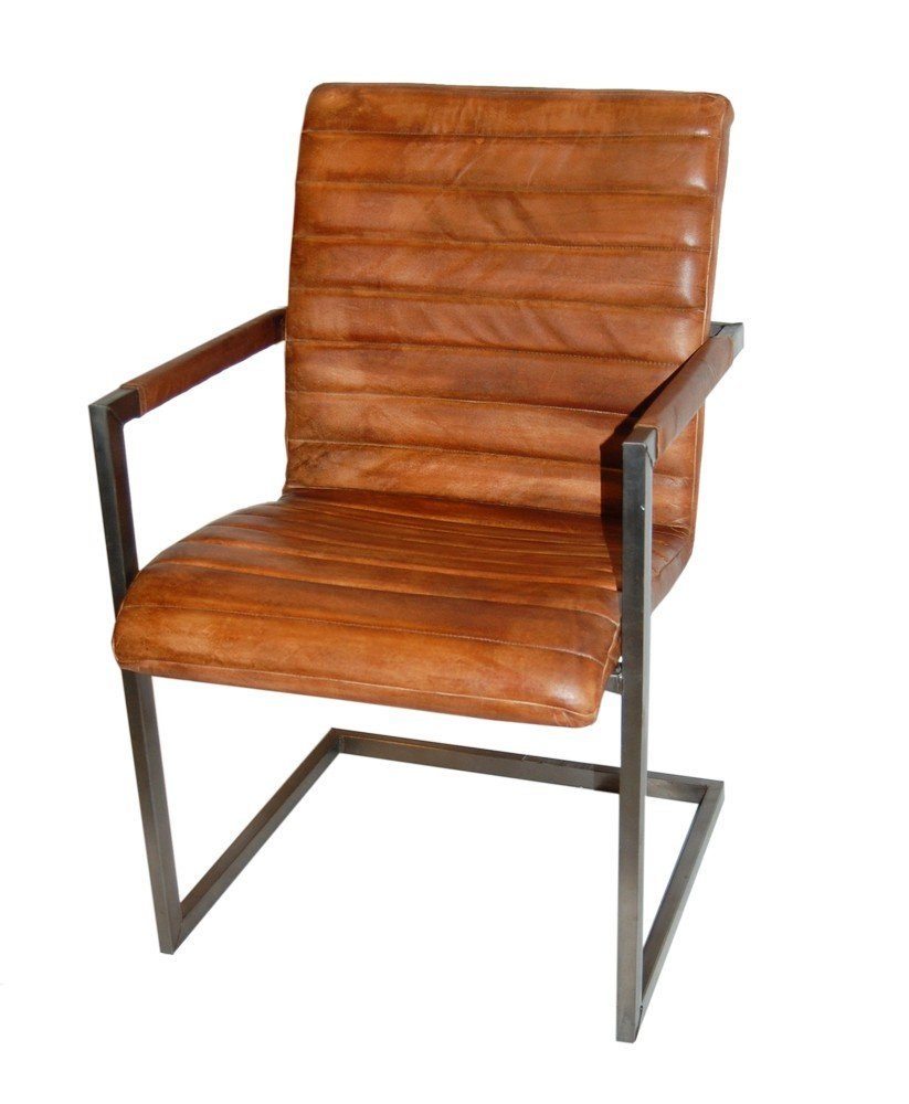 Fräck karmstol i zinkfärgad metall / brun läder med en vintage stil.