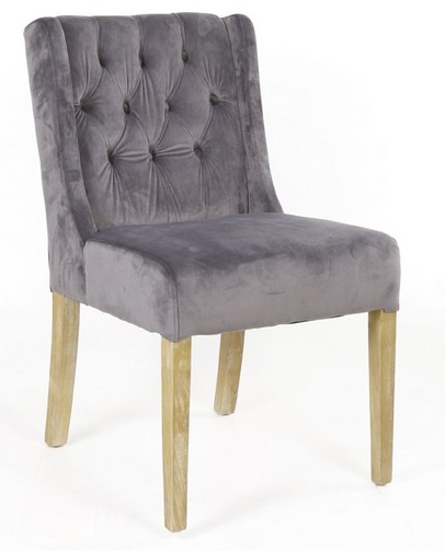 Stilfull stol som är kläd i ett grått sammetstyg, underrede av massivt antikbehandlat trä. Djuphäftade knappar i ryggen som en tidsenlig detalj. Zigzag-fjädring.