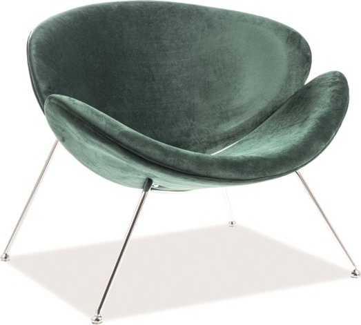 Fåtölj av kromad metall. Klädd med polyestertyg i sammetsimitation.