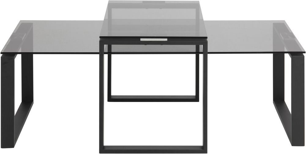 Set med två soffbord. Underredet är tillverkat av svart pulverlackerad metall och bordsskivan är av 8 mm rökfärgat klarglas.