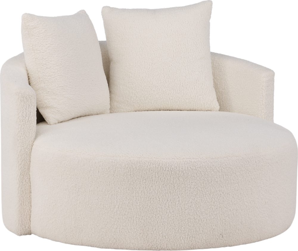 En romantisk 2-sitssoffa med inbjudande rund utformning och mysig design kommer garanterat höja stilnivån i ditt hem. Soffan har en helklädd klädsel i vitt teddytyg med en rundad rygg, cylinderformad sits och två kuddar. Den här soffan passar utmärkt i det moderna hemmet och skapar snabbt ett trivsamt blickfång i vardagsrummet.