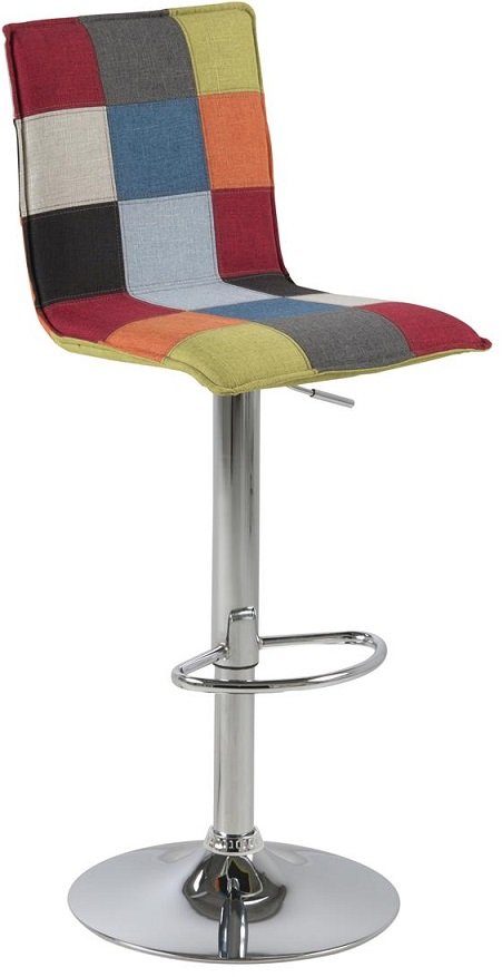 Stilrent och skön barstol från vår Kentucky serie. Klädd i snyggt patchwork tyg med flera olika färger. Höj och sänkbar sits med TÜV märkt gasfjädring. Kromad trumpetfot med fotstöd.
