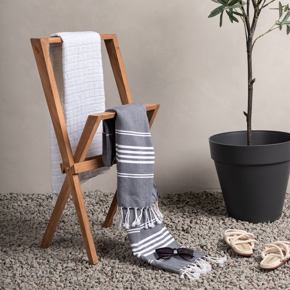 En modern och nätt hängare i teak som passar perfekt som en fin inredningsdetalj eller kombinerad förvaring genom att hänga handdukar eller andra textilier på. Hängaren är enkel att fälla ihop och förvara och passar i alla typer av hem. Skötselråd: Våra teakprodukter produceras av certifierad teak som är odlad för ändamålet och inte skövlade från ömtålig regnskog. Som ett av de tåligaste träslagen innehåller teak mycket olja som sedvanligt behövs för att inte materialet ska spricka. Eftersom träslaget innehåller naturligt mycket behöver inte möblerna impregneras lika ofta.