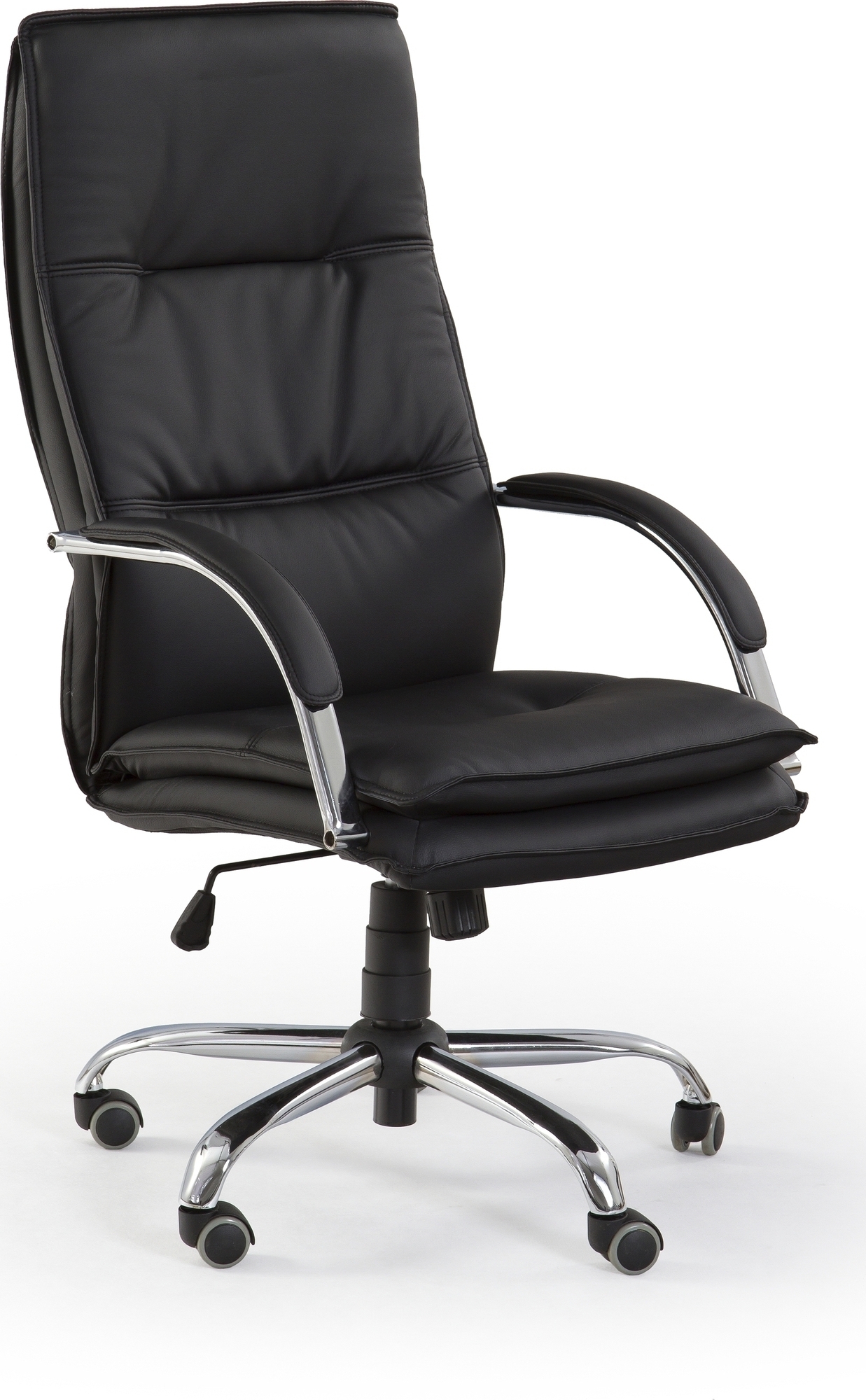 Stilren kontorsstol med en klassisk design. Sitsen och ryggstödet är klädda med ett mycket behagligt svart konstläder för maximal komfort. Sitsen är höj- och sänkbar samt är stolen lätt att förflytta tack vare hjulen på den kromade stjärnfoten.