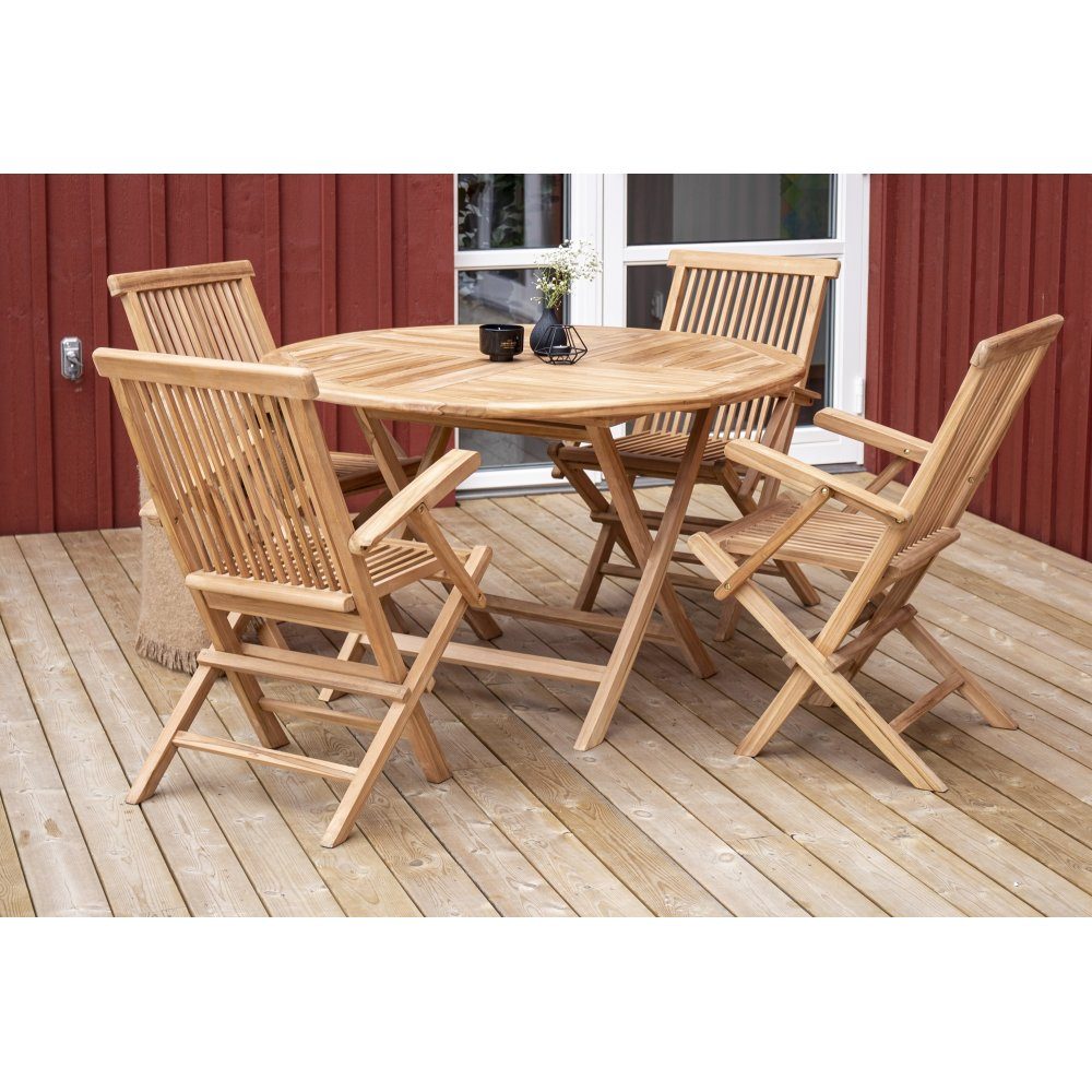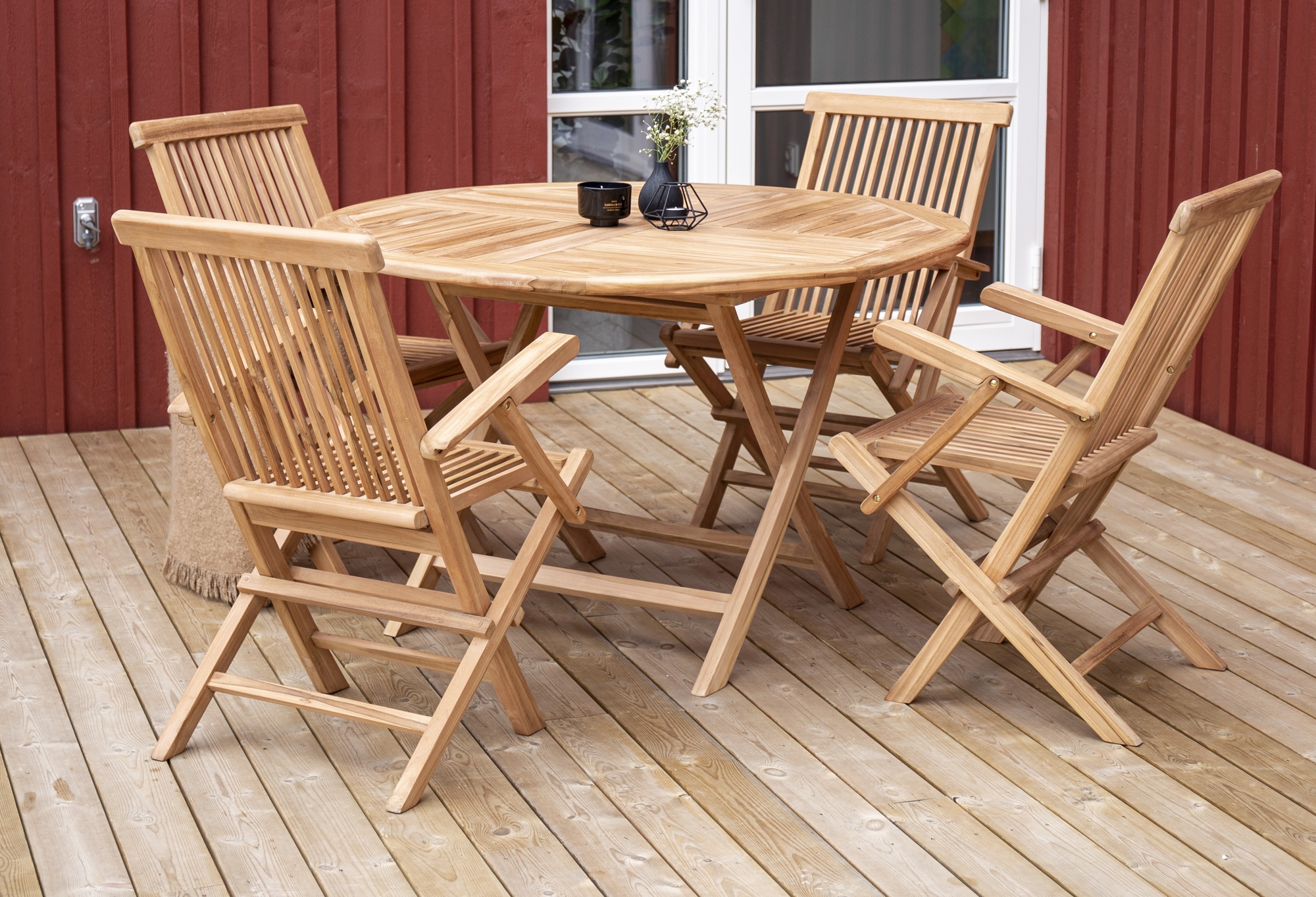 Skötselråd: Våra teakmöbler produceras av certifierad teak som är odlad för ändamålet och inte skövlade från ömtålig regnskog. Som ett av de tåligaste träslagen innehåller teak mycket olja som sedvanligt behövs för att inte materialet ska spricka. Eftersom träslaget innehåller naturligt mycket behöver inte möblerna impregneras lika ofta.