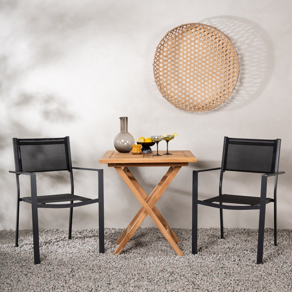 En inbjudande matgrupp för två som garanterat förlänger trivsamma stunder i sommar! Kenya cafébord är det perfekta, hopfällbara bordet i vacker teak som passar utmärkt för sommarens alla utefrukostar och eftermiddagsfikor. Med sitt klassiska utförande och smidiga design är bordet enkelt att matcha och smidigt att flytta runt. Mått: 70x70 cm. Här tillsammans med 2st stolar från serien Copacabana. Stolarna är stapelbara med en sits i svart textilene och ram i aluminium. Låt tiden här bli dagens höjdpunkt!