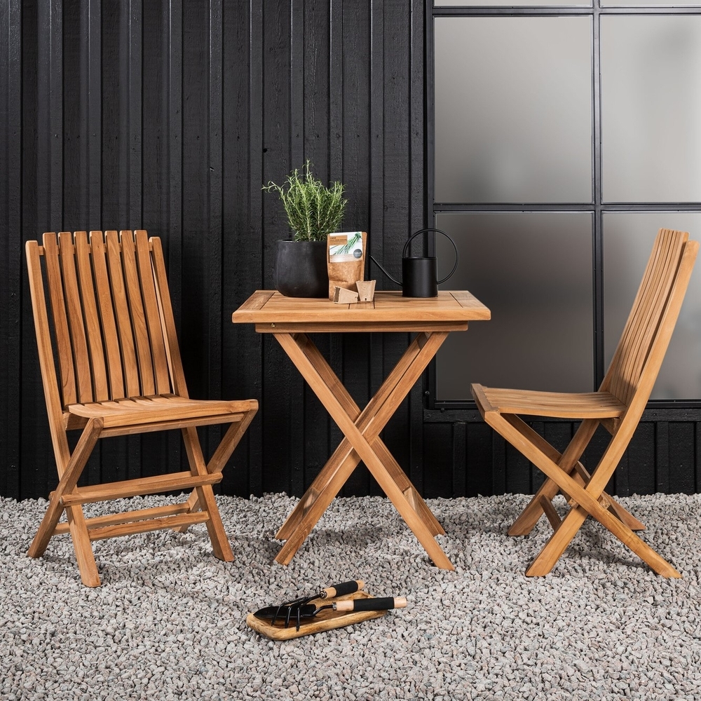 En läckert matchande cafégrupp i modern design och lyxig look! Kenya cafébord är det perfekta bordet i vacker teak som passar utmärkt för sommarens alla utefrukostar och eftermiddagsfikor. Med sitt klassiska utförande och smidiga design är bordet enkelt att matcha och smidigt att flytta runt. Mått: 70x70 cm. Här tillsammans med trendsäkra matstolar från serien Ghana i matchande teak. Stolarna är hopfällbara och har en inbjudande design - njut av fikan utomhus i sommar!