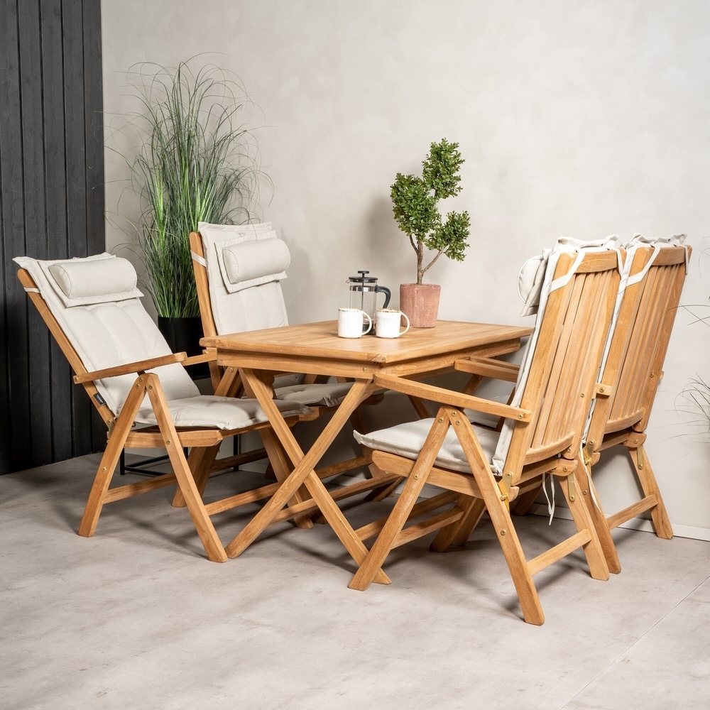 Möblera uteplatsen i jordnära kulörer med en matgrupp i skandinavisk design! Vårt omtyckta, rektangulära matbord Kenya har en tidlös design med ribbat utförande i smakfull teak. Kryssbenen ger ett stadigt och charmigt intryck. Mått: 120x70 cm. Här i smäcker kombination med 4st läckra matstolar från samma serie. Stolarna är fällbara för optimal avkoppling och har armstöd för extra komfort. Möblera uteplatsen inbjudande och skapa ett blickfång som imponerar!