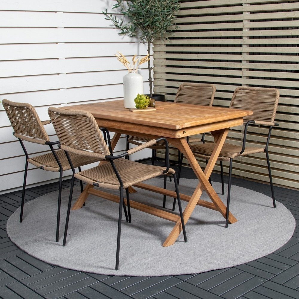 Möblera uteplatsen i jordnära kulörer med en matgrupp i skandinavisk design! Vårt omtyckta, rektangulära matbord Kenya har en tidlös design med ribbat utförande i smakfull teak. Kryssbenen ger ett stadigt och charmigt intryck. Här i smäcker kombination med läckra matstolar från serien Lindos. Stolarna har integrerade armstöd i svart stål och en sits i slitstarkt, lattefärgat rep. Möblera inbjudande på uteplatsen och skapa ett blickfång som imponerar!