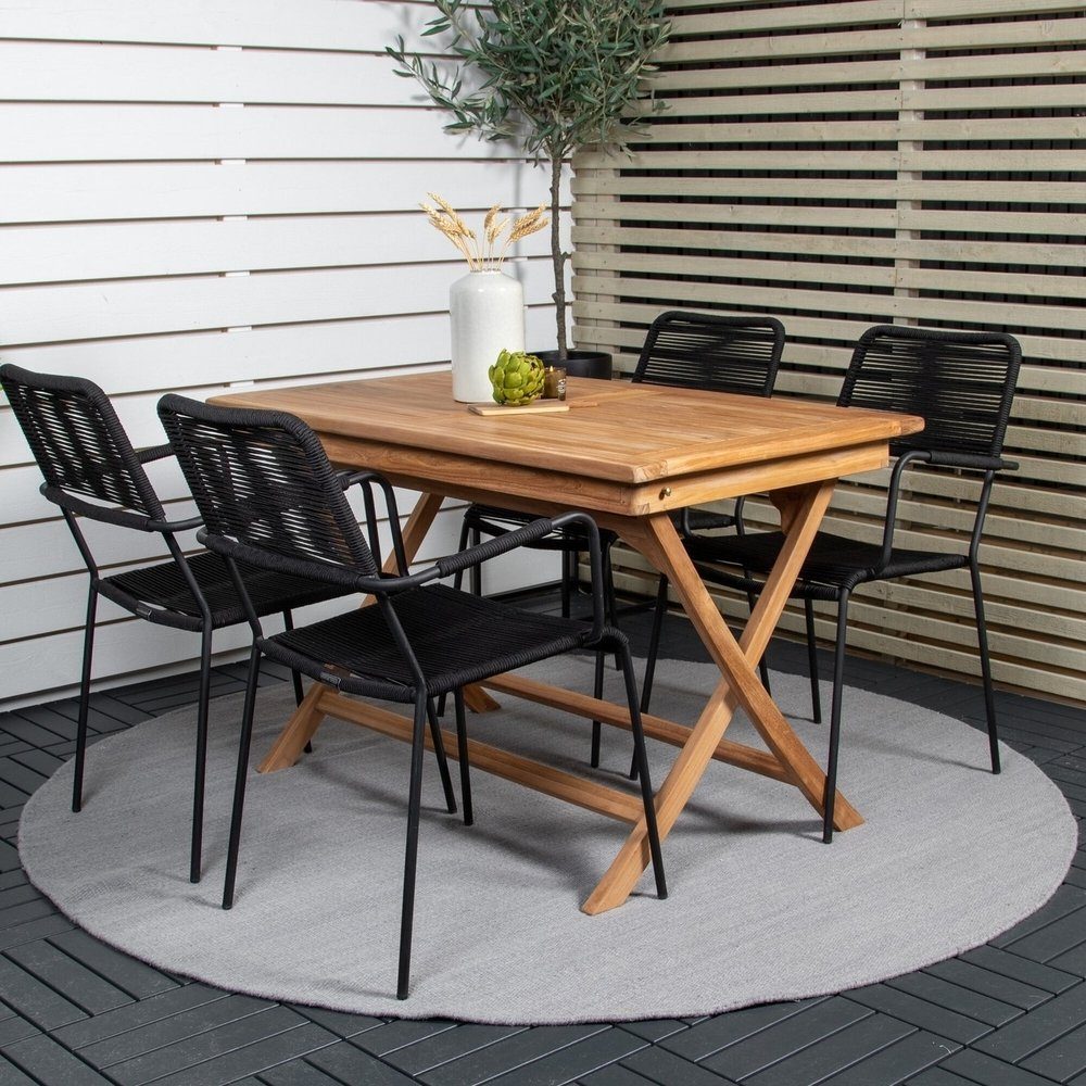 Stilren, trendsäker och bekväm matgrupp i skandinavisk design! Vårt omtyckta, rektangulära matbord Kenya har en tidlös design med ribbat utförande i smakfull teak. Kryssbenen ger ett stadigt och charmigt intryck. Här i smäcker kombination med läckra matstolar från serien Lindos. Stolarna har integrerade armstöd i svart stål och en sits i slitstarkt, svart rep. Möblera inbjudande på uteplatsen och skapa ett blickfång som imponerar!