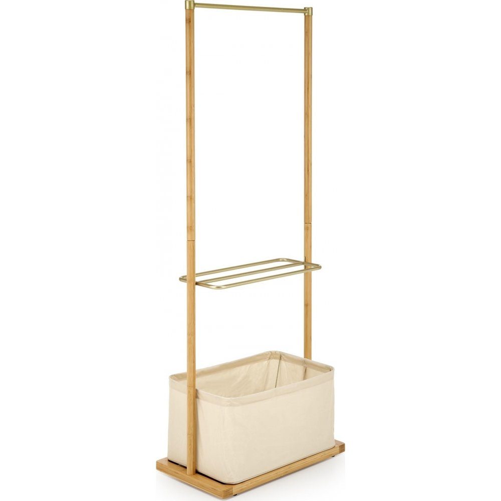 Klädhängare av bambu med hylla av pulverlackerad stål och förvaringslåda av tyg.