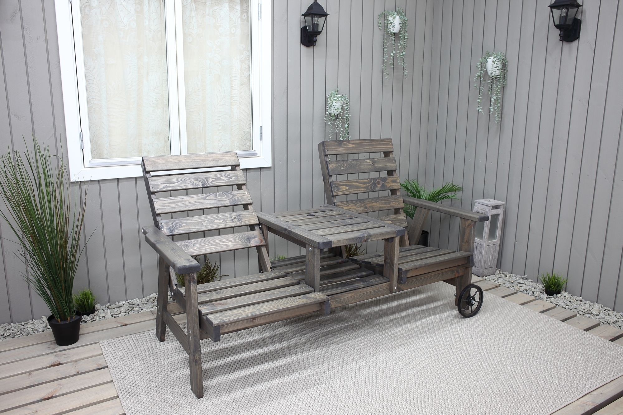 Trädgårdsbänk med två sittplatser och ett bord emellan i grålaserad furu med klassisk uttrycksfull design. Fungerar utmärkt som grupp eller som ett rent smycke i trädgården.