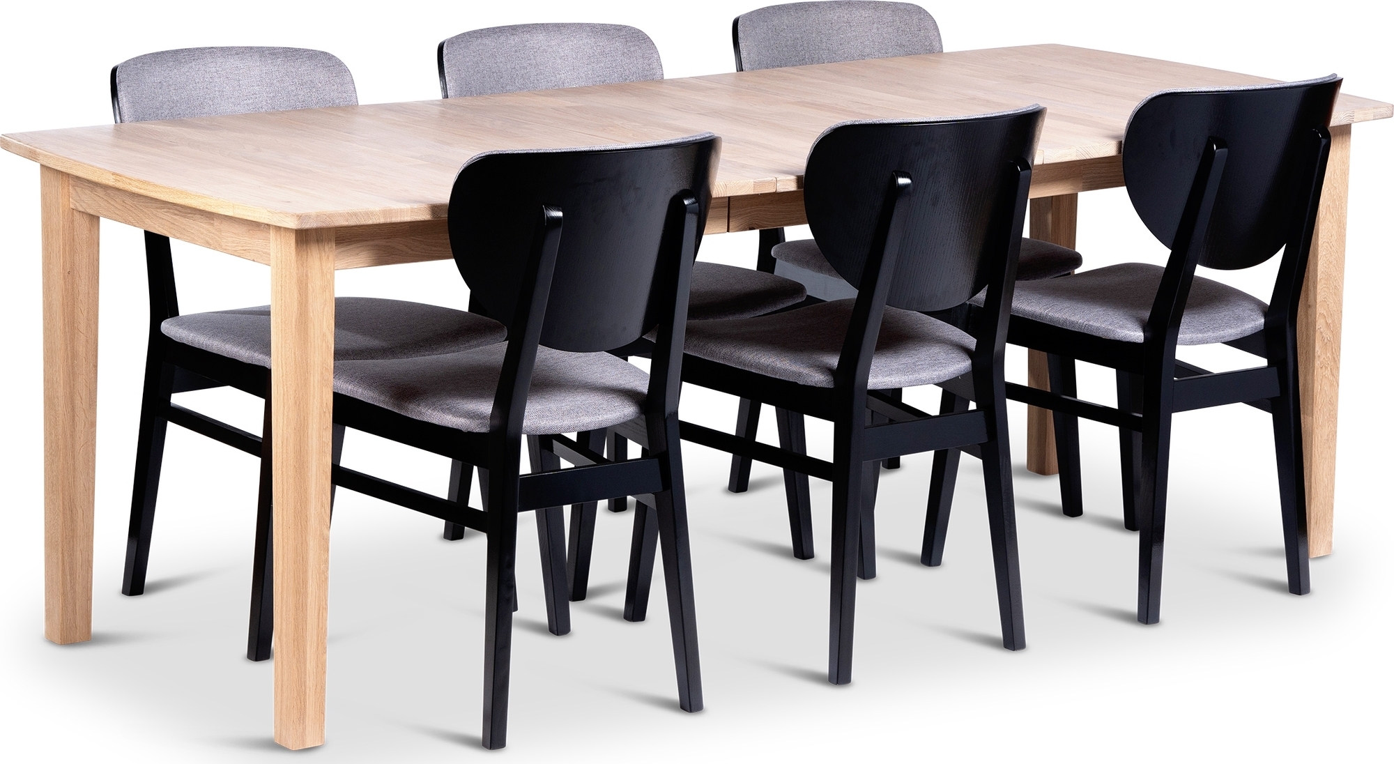 Oval matgrupp i massiv vitoljad ek med bågformade kanter och 6 svart stolar i massiv ask, den medföljande iläggskivan gör att bordet kan förlängas till hela 210 cm.