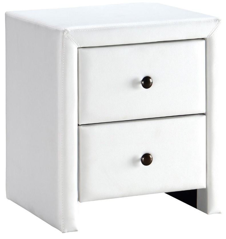 Ett snyggt sängbord med en modern design. Tillverkad i MDF med en mysig klädsel i vitt konstläder. Två praktiska lådor för smart förvaring.