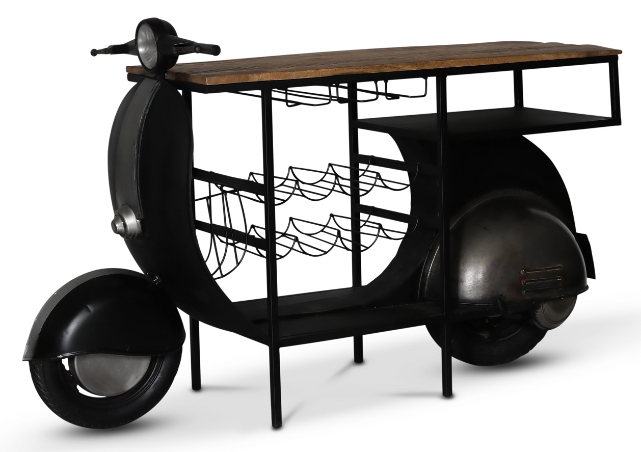 Denna klassiska Vespa som bardisk är något för entusiasten. Topp av massivt mangoträd, stomme av metall färgad i svart och silver. En originell möbel med stil.