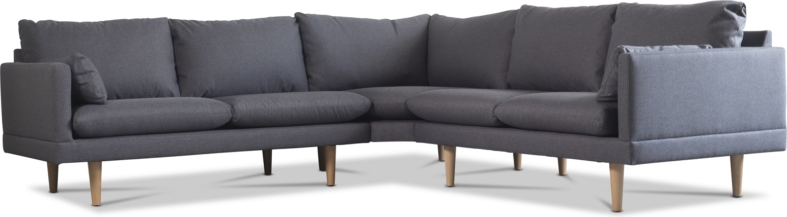 Modern soffa i ett mjukt och slitstarkt tyg, Malmö 95 mörkgrå, med massiva träben i ekbets. Stoppning i sittdynor är 35kg Kallskum av högkvalitè. Soffan har generösa sittytor.