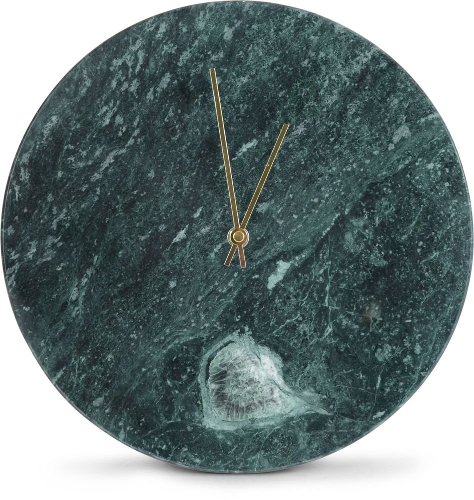 En snygg och modern väggklocka i Grön marmor med guldfärgade visare.