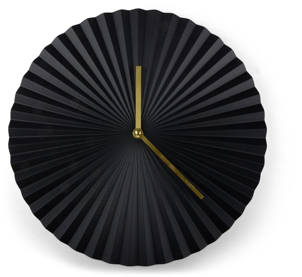 En snygg och modern väggklocka i svart MDF med guldfärgade visare.
