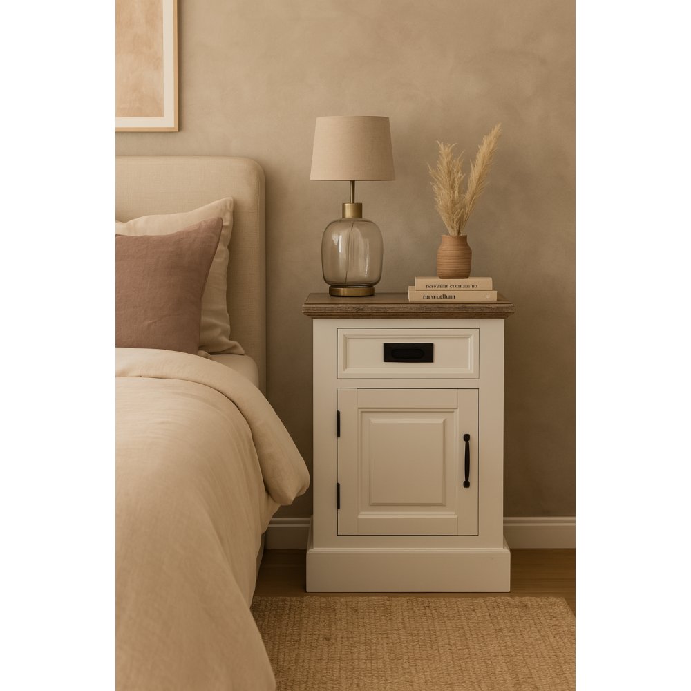Knight sängbord kombinerar modern design med klassisk charm. Det stilrena sängbordet i vitt och grått har en låda och en dörr som ger praktiskt förvaringsutrymme, medan de svarta handtagen skapar en elegant kontrast till det ljusa utförandet.