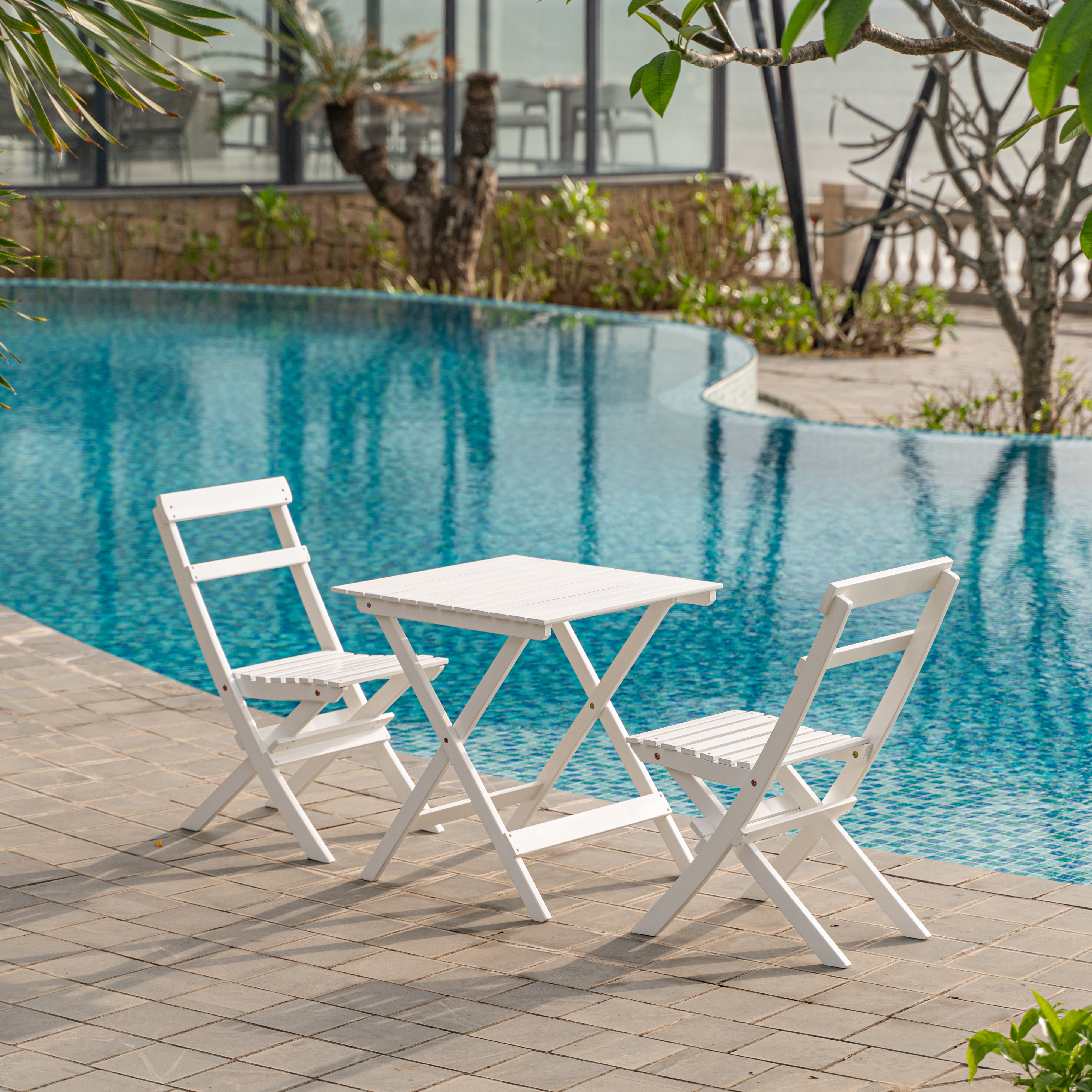 Klassisk nätt liten utegrupp i vitlaserat trä för trädgården. Settet är komplett med 2 st stolar och bord. En utegrupp som smälter bra in i de flesta trädgårdar.