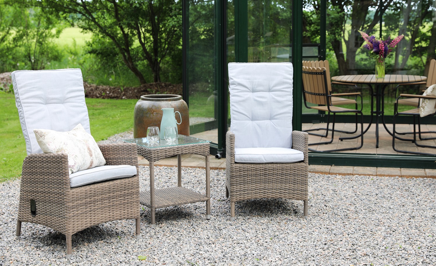 Knutsberg utegrupp bestående av 2 ställbara fåtöljer i ljusbrun konstrotting med grå dynor av polyester för god komfort. Hållbar ram av aluminium. Medföljer gör också ett matchande bord i rotting med toppskiva av glas.