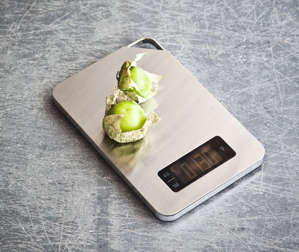 Köksvåg i 18/0-stål och ABS-plast med LCD-display. Vågen kan ange vikter mellan 1 - 3000 gram, finns även funktion för att vissa ounches. Köksvågen har timerfunktion. Vågen kan med fördel användas för att väga flera ingredienser i samma skål efter varandra, då nollställer du bara vikten innan du fyller på med mer ingredienser.