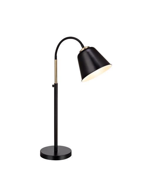 Kolding bordslampa i svart metall med detaljer i antikfärgad mässing. Justerbar i höjd och med ställbart huvud. 2 meter sladd med strömbrytare på sladden. Stor lamphållare (E27) för max 60W glödljus eller motsvarande styrka i lågenergi, halogen, LED.