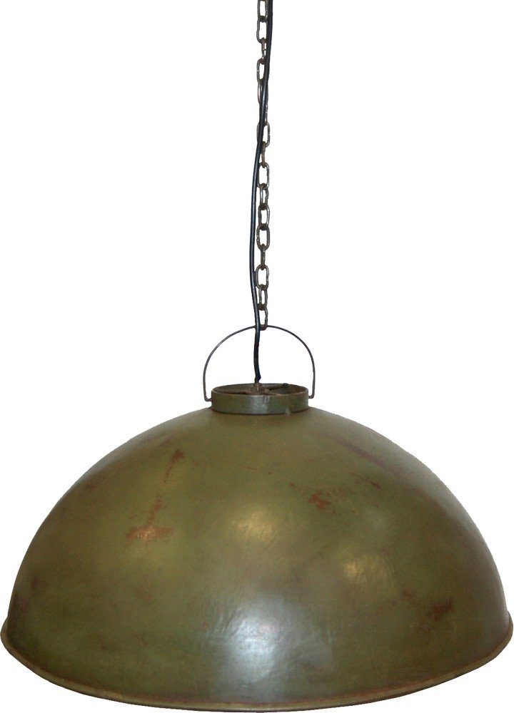 Taklampa i vintage med stor skärm i flaskgrön metall med kedja för upphängning.