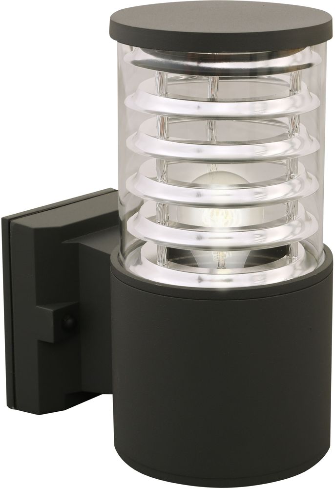 Utomhus vägglampa i mörkgrå metall och klarglas. Monteras lätt på husväggen.