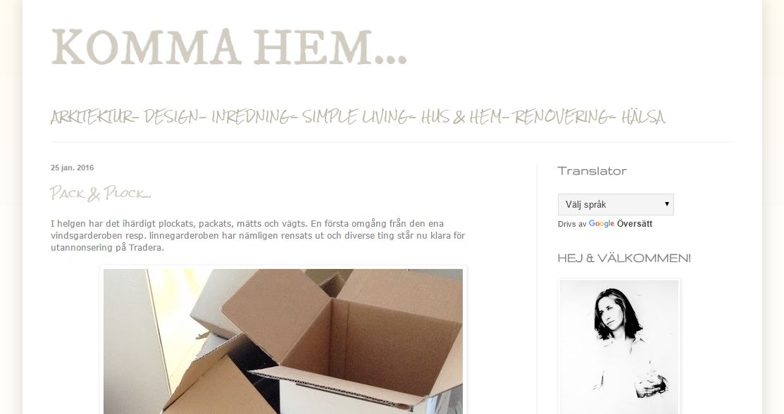 Tina som driver bloggen KOMMA HEM skriver om reflektioner runt inredning, rensa och förenkla. Hon själv inledde sitt arbete med att rensa ut i hemmet 2015 och det pågår fortfarande. Nu läser hon till Cert. Inredare med Feng shui. Tina bor i en villa byggd 1936, från vilken vi hittar bilder under Hemma hos mig, det som gäller är förstås Feng shui och simple living. Men intressena är många och inkluderar även mat och dryck. Filmdekor en annorlunda och rolig etikett vi hittar här Tina länkar dessutom till sajter på detta tema som är lätt att förlora sig i. Rensa och organisera något vi alla med säkerhet skulle behöva bli bättre på!