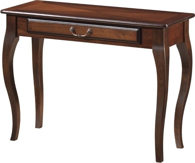 Ett härligt konsolbord med en klassisk design. Stommen är tillverkad av trä och bordsskivan av MDF med ett mycket vackert fanér med valnöts utförande. Rustad med en låda för lätt förvaring.