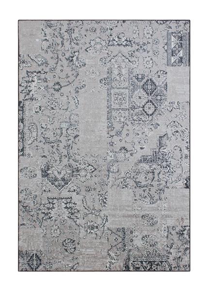 Nagari har ett melerat patch-mönster i vita, grå och beige toner, med en langettering i mörkgrått. Eftersom mattan är vävd i viskos så har den en fin lyster, samt att färgerna skiftar beroende på hur ljuset faller.